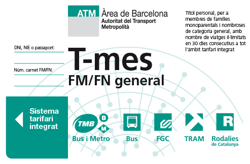 Títol personal i intransferible per a membres de famílies monoparentals i nombroses de categoria especial, amb un nombre il·limitat de viatges integrats en 30 dies consecutius a les zones delimitades per la primera validació, en tots els modes de transport, segons les zones per les quals es transiti (com a màxim, es paguen 6 zones). Ha d’anar acompanyat d’un document oficial acreditatiu i en vigor del seu titular i del carnet de família monoparental o nombrosa.