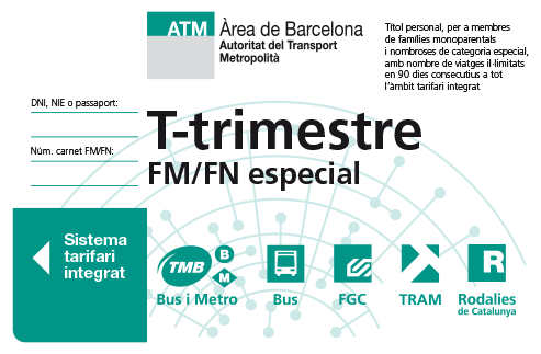 Títol multipersonal i horari per a membres de famílies monoparentals i nombroses de categoria especial, de 70 viatges integrats en 90 dies consecutius des de la primera validació, en tots els modes de transport, segons les zones per les quals es transiti (com a màxim, es paguen 6 zones). Ha d’anar acompanyat del carnet de família monoparental o nombrosa.
